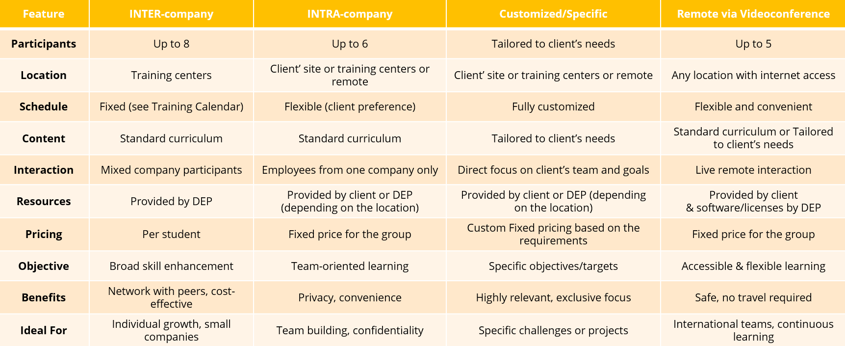 Exclusive training events, scheduled flexibly around your team's availability. Conducted on-site at your premises or at our state-of-the-art training centers, these sessions ensure a focused learning environment tailored to your company.