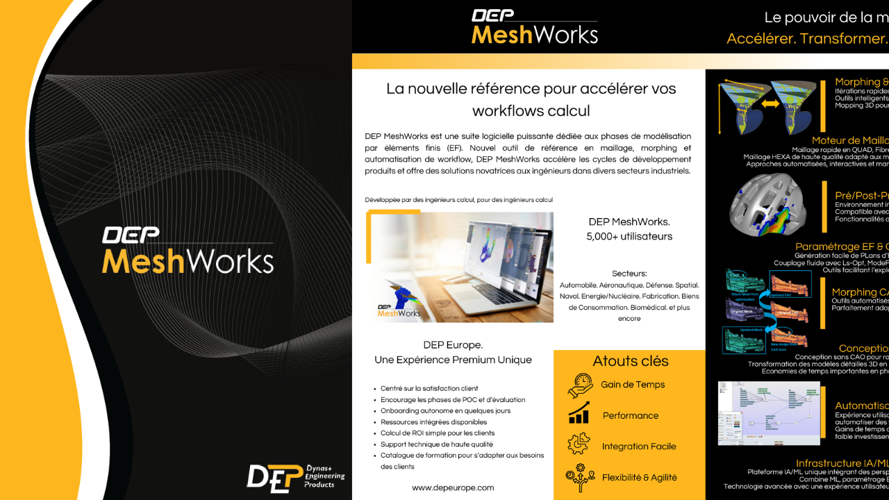Explorez une sélection de brochures techniques mettant en avant les solutions innovantes offertes par DEP MeshWorks. Que vous cherchiez un aperçu de nos technologies, un guide détaillé ou un catalogue de formation, nos ressources sont conçues pour répondre à vos besoins.
