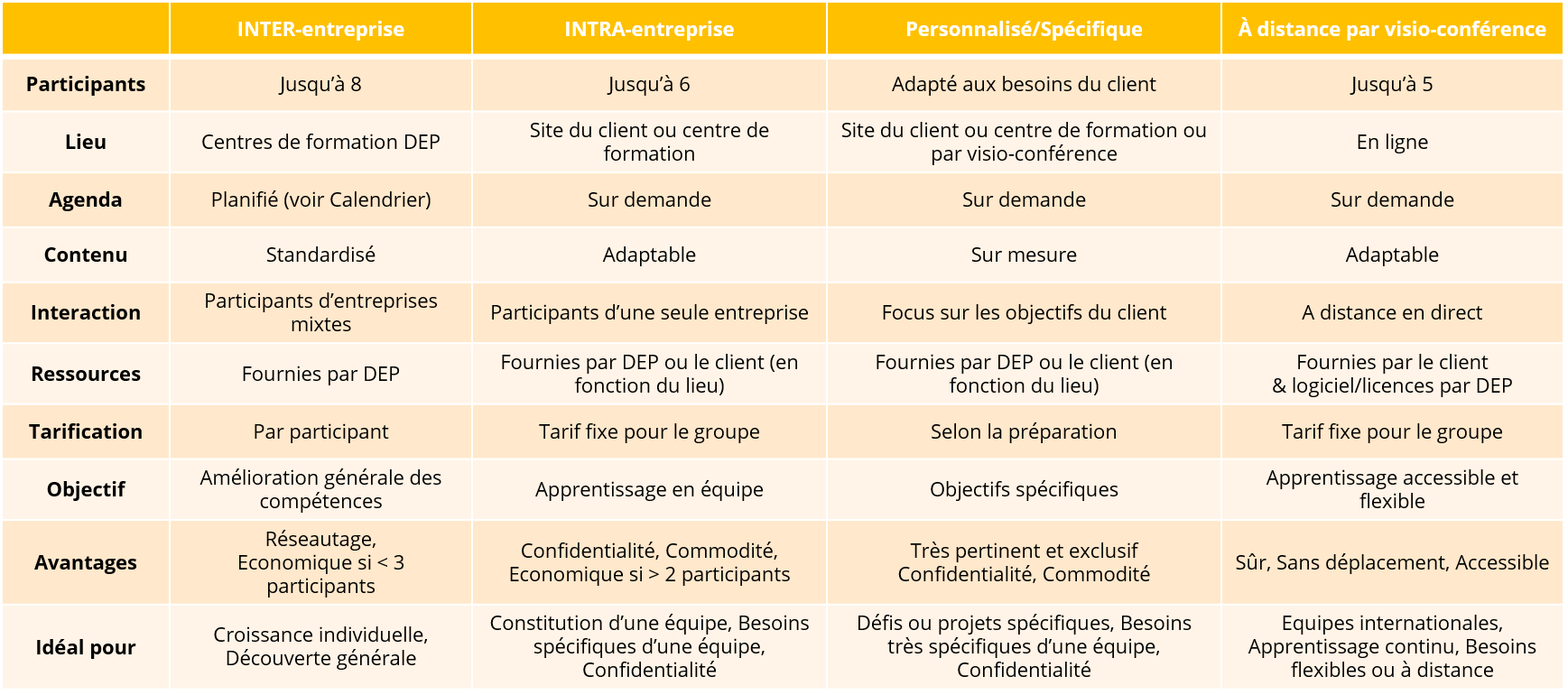 Événements de formation exclusifs, planifiés en fonction de la disponibilité de votre équipe. Réalisées sur site, dans vos locaux ou dans nos centres de formation, ces sessions garantissent un environnement d'apprentissage concentré et adapté à votre entreprise.